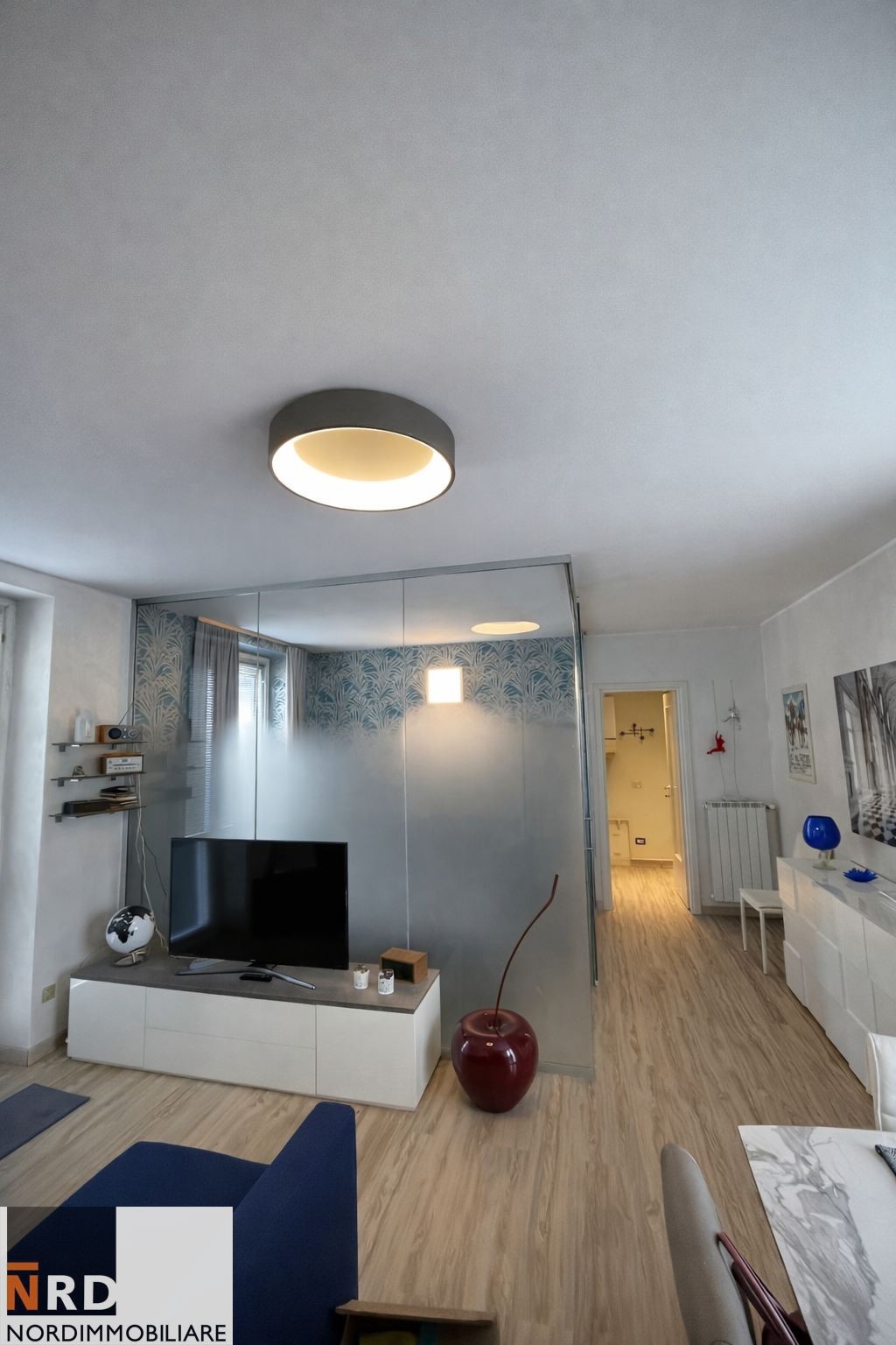 Un'elegante parete in cristallo separa armoniosamente la zona giorno dalla zona notte, creando continuità ed allo stesso tempo privacy.