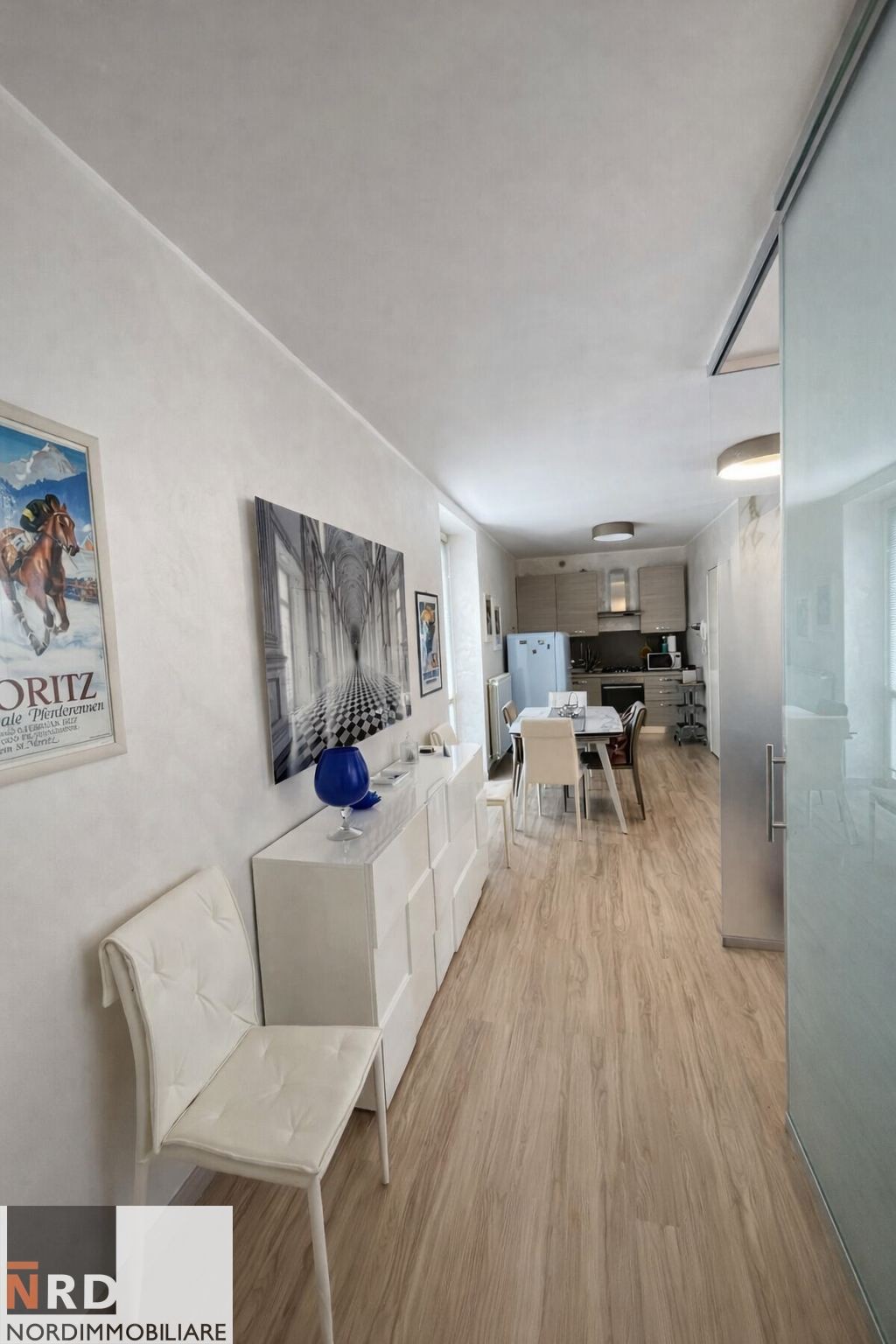 Un'elegante parete in cristallo separa armoniosamente la zona giorno dalla zona notte, creando continuità ed allo stesso tempo privacy.